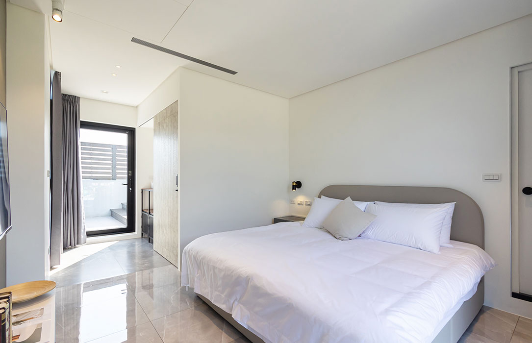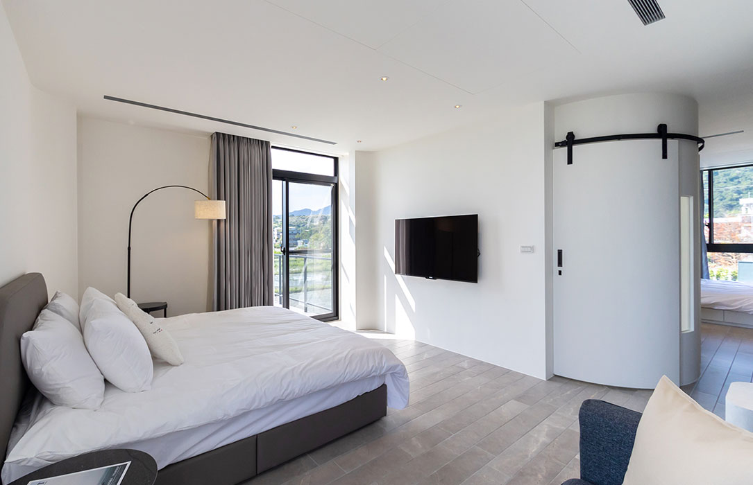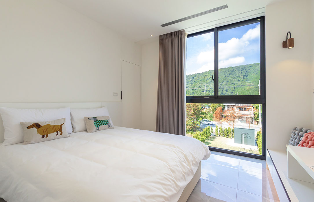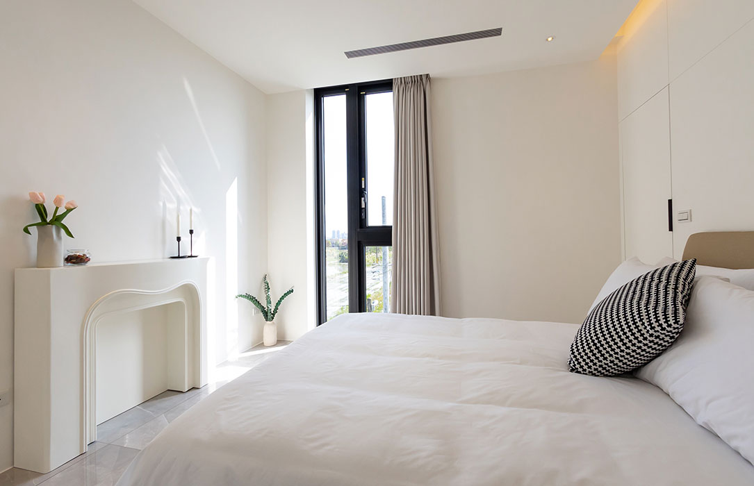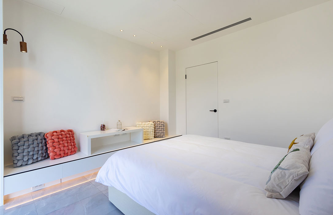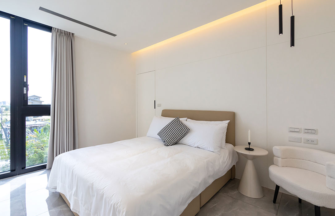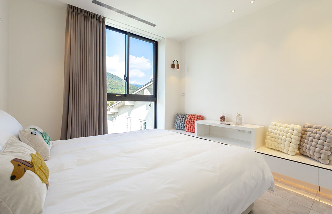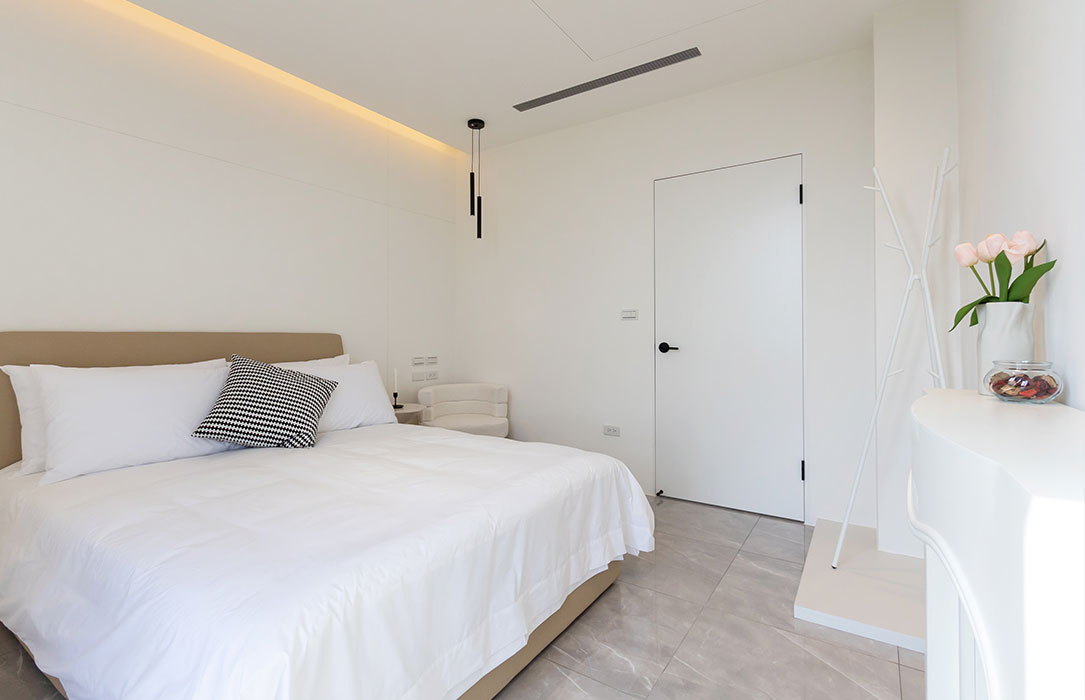 不是一層不染的白,而是自然溫暖的米白色;陽光自落地窗灑落,營造出舒服放鬆的氛圍。
